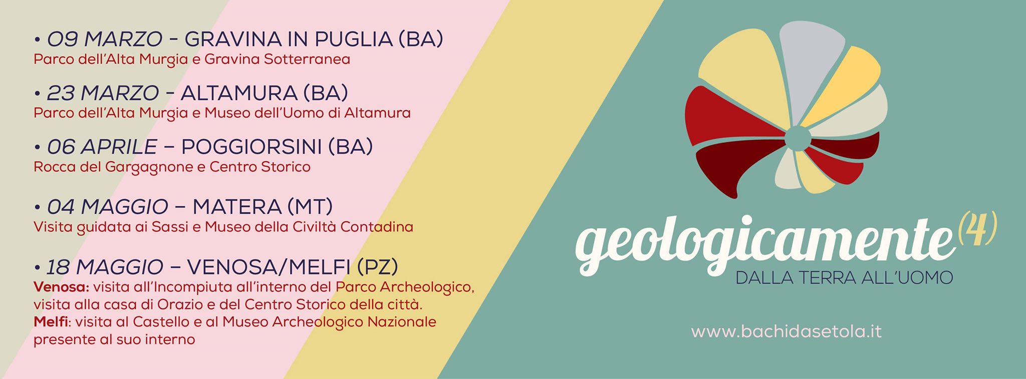 Con il progetto “Geologicamente 4”, Bachi da Setola si propone come un valido strumento divulgativo di conoscenza dei fenomeni geologici del nostro territorio, delle problematiche ad essi connessi, nonché, come strumento di conoscenza della storia antica e recente dell’uomo in Puglia e Lucania, delle tradizioni e delle leggende dei luoghi. Tale progetto rappresenta quindi per i partecipanti un modo per riscoprire la giusta dimensione umana, con l’augurio che vengano risvegliate le coscienze e che siano altresì invogliati ad approfondire gli aspetti territoriali fondamentali e peculiari.