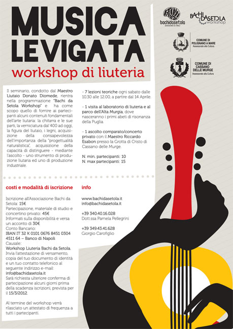 Il seminario, condotto dal Maestro Liutaio Donato Diomede, rientra nella programmazione “Bachi da Setola Workshop” e  ha come scopo quello di fornire ai partecipanti alcuni contenuti fondamentali dell’arte liutaria: la chitarra e le sue parti, la verniciatura dal ‘400 ad oggi, la figura del liutaio, la verniciatura, i legni, acquisizione …